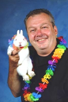 Magician Richard Landry holding his bunny rabbit, Snowball