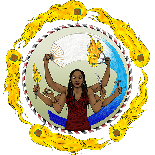 A smiling woman with multiple arms holding tools and flames. The image is surrounded by torches.