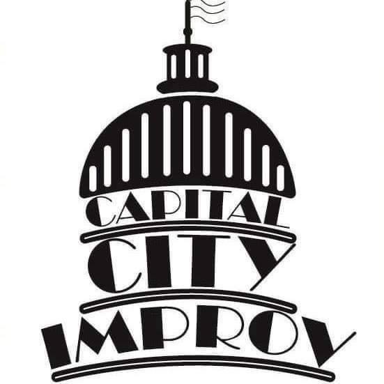 the words "Capital City Improv" in the shape of the Illinois state capitol building.