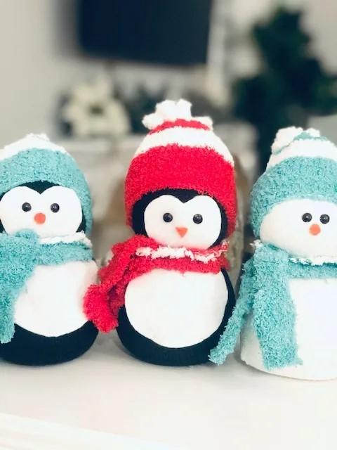 Two penguins and a snowman wearing red and blue hats and scarves.